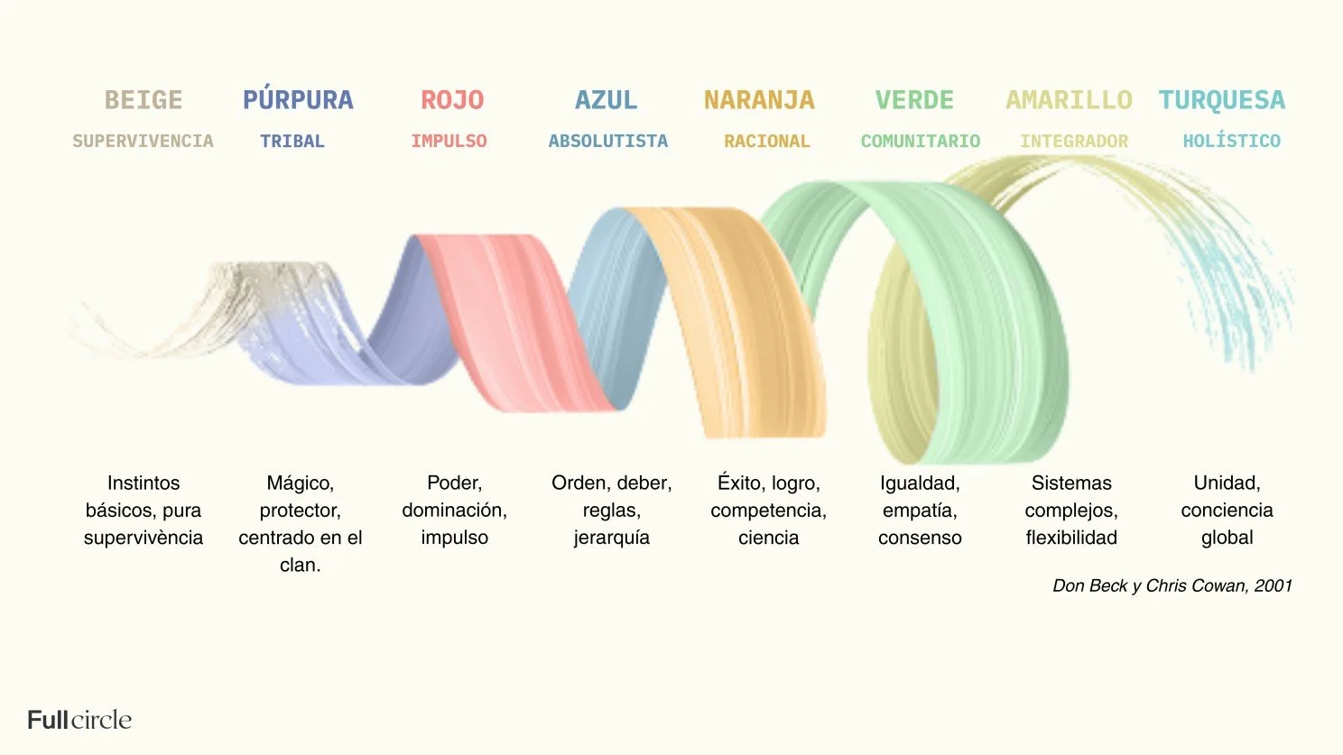 Su gran hallazgo fue descubrir que cada vez que resolvemos los desafíos de un nivel de conciencia, surgen otros nuevos que solo pueden afrontarse desde un nivel superior. De ahí nació el concepto de “sistemas de valores”, donde cada etapa representa una forma distinta de entender el mundo, relacionarnos y organizarnos como sociedad.