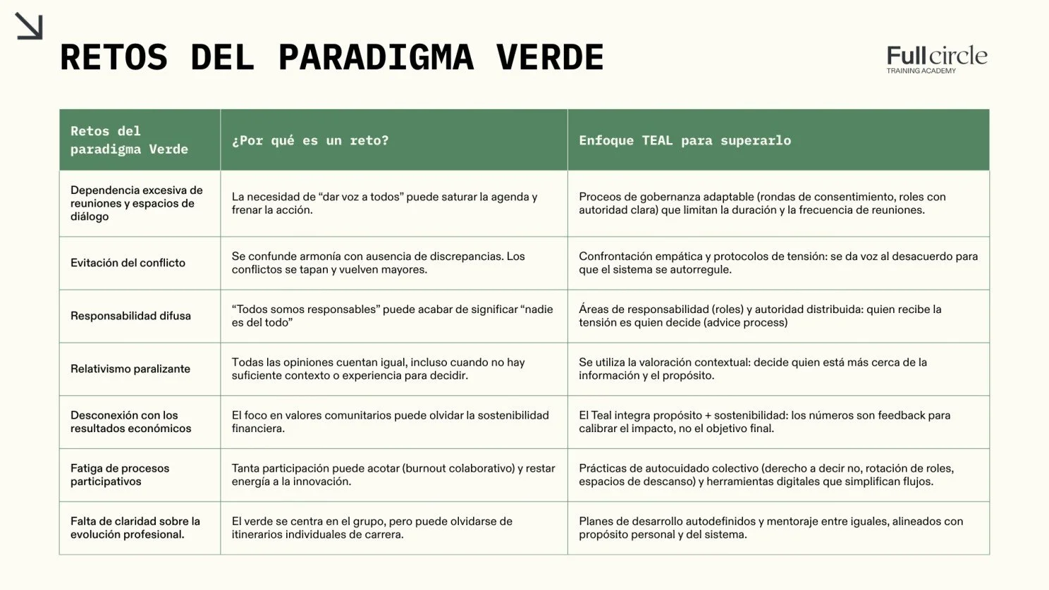 Desde Full Circle Team observamos estos patrones de manera recurrente en cooperativas y organizaciones en transformación. Muchas creen estar avanzando, cuando en realidad están atrapadas en un Verde reactivo.